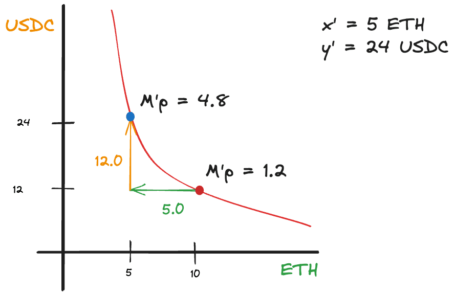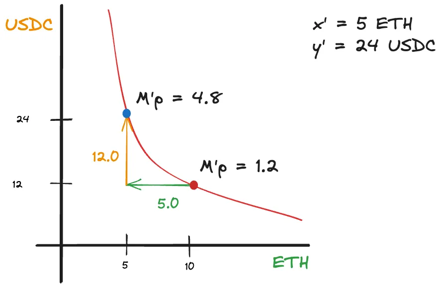 Pretty simple, right? By selling 3,000 USDC, you moved from (10.0, 12,000) to (8.0, 15,000) on the curve.